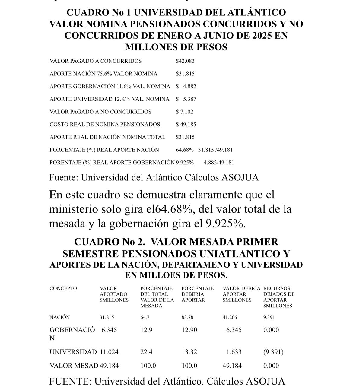 El cuadro No 2, muestra que el ministerio de hacienda en el bono pensional que gira semestralmente deja de enviar a la universidad $9.391 millones, o sea $18.782 millones en el año 2025, y la gobernación dejó de girar durante ese año $2.926 millones. Entre ambas entidades dejaron de enviarle al Fondo de Pensiones de la Universidad del Atlántico en una Fiduciaria $21.708 millones.