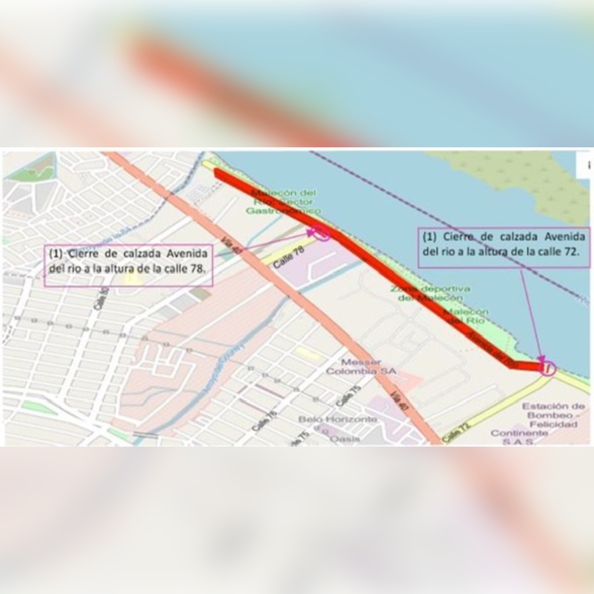 Cierre total de la Avenida del Río entre calles 72 y 78.